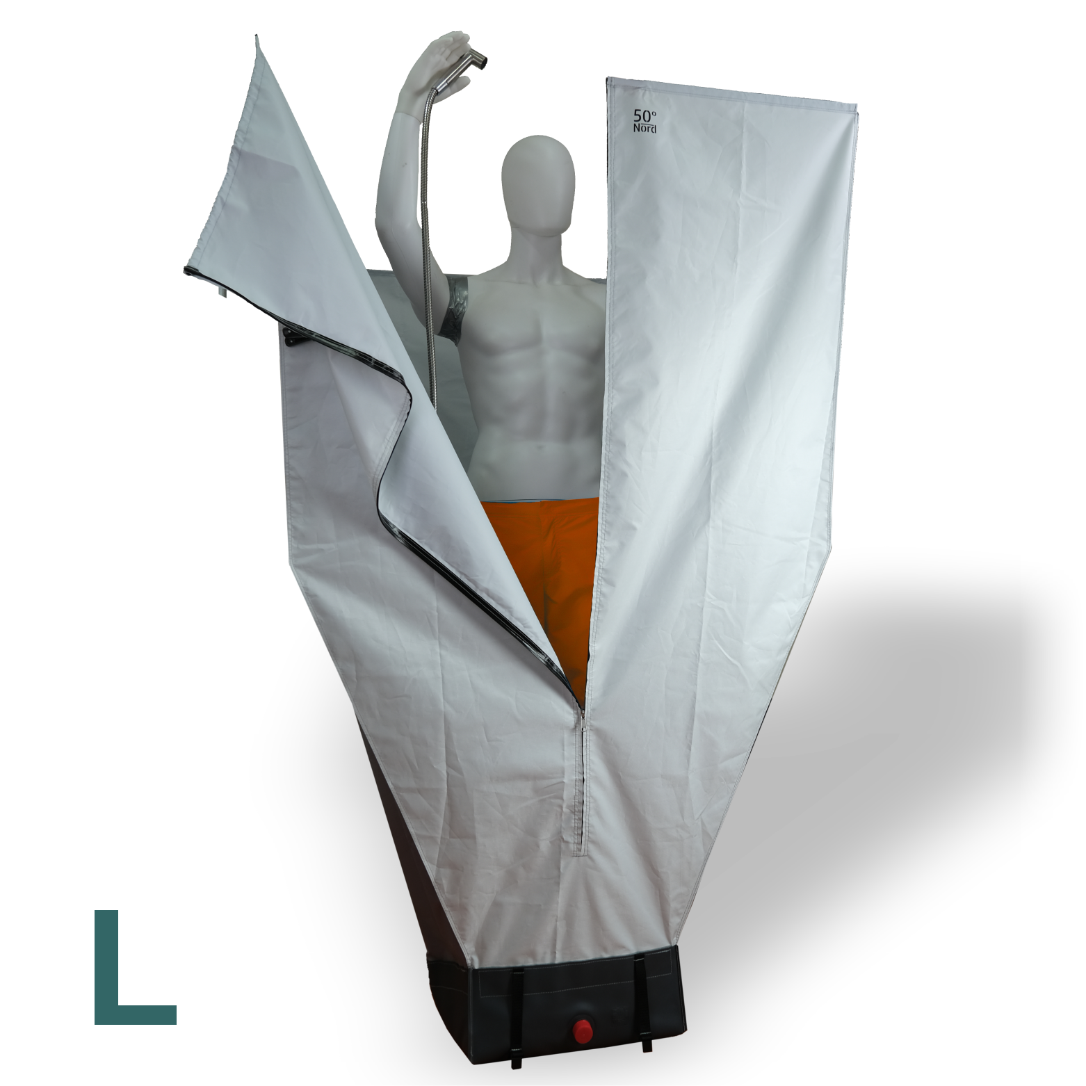 Eine Reißverschlussöffnung auf der Rückseite der Duschkabine ermöglicht den Zugriff zum Waschbecken, zur Küche oder zu den Schränken. Auch der Duschschlauch kann hier durchgeführt werden.