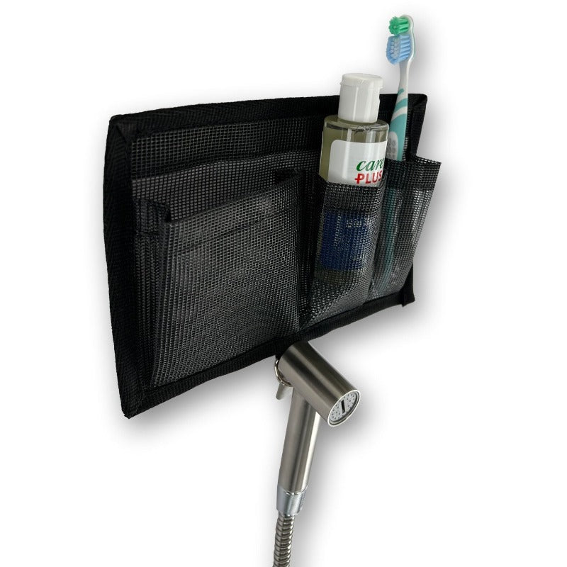 Moisture-resistant mesh pocket for storing shower gel, shampoo, toothbrush, razor and whatever you want to use in the shower.